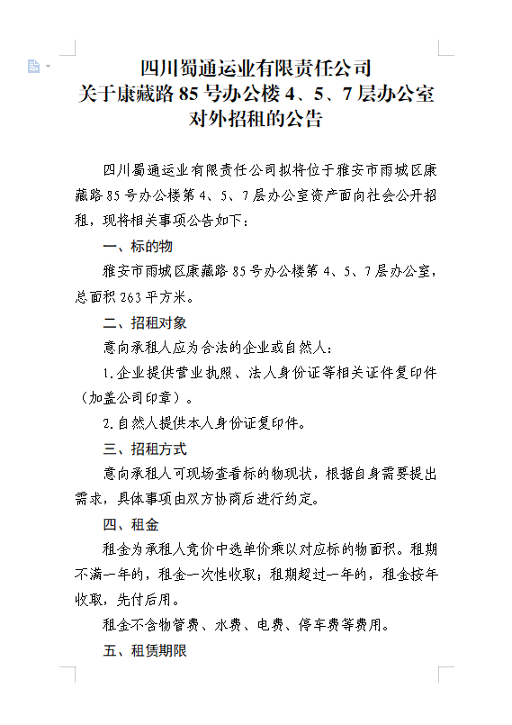 四川蜀通運(yùn)業(yè)有限責(zé)任公司關(guān)于康藏路85號辦公樓4、5、7樓資產(chǎn)租賃公告