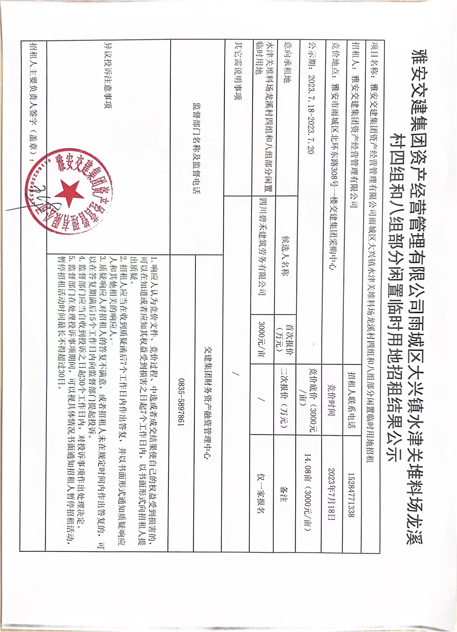 雅安交建集團(tuán)資產(chǎn)經(jīng)營管理有限公司雨城區(qū)大興鎮(zhèn)水津關(guān)堆料場龍溪村四組和八組部分閑置臨時用地招租結(jié)果的公示