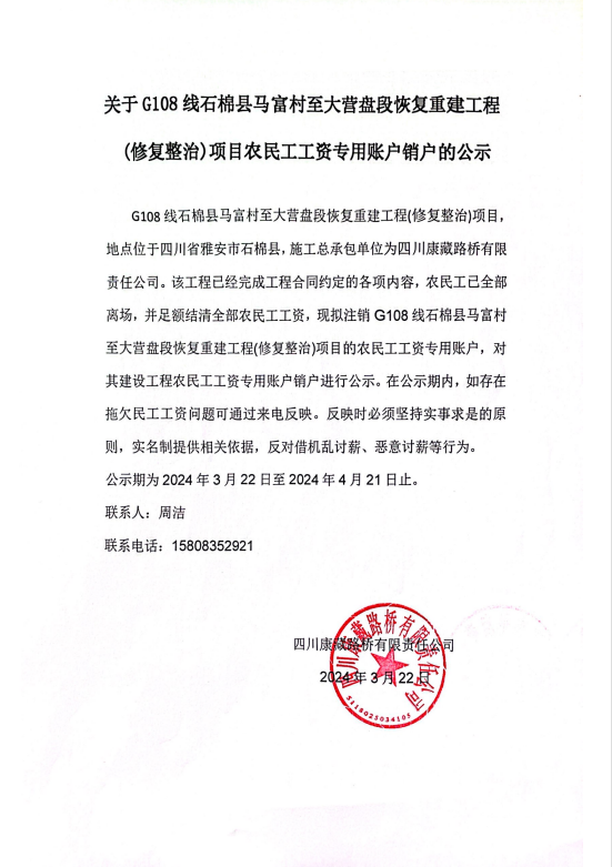 關(guān)于G108線石棉縣馬富村至大營盤段恢復(fù)重建工程(修復(fù)整治)項目農(nóng)民工工資專用賬戶銷戶的公示