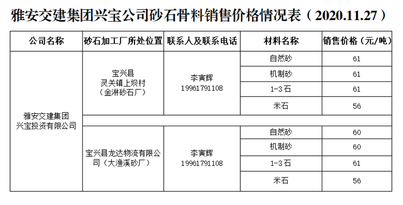 雅安交建集團興寶公司砂石骨料銷售價格情況表(2020.11.27)