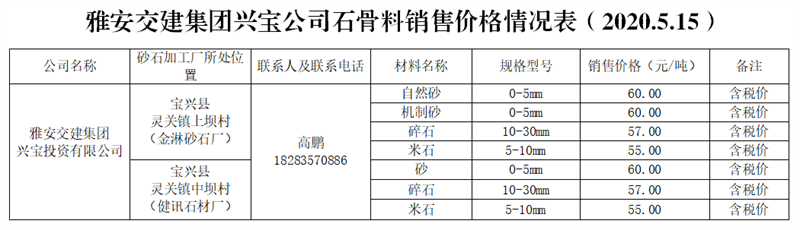 興寶投資有限公司。興寶公司是寶興縣人民政府指定寶興縣發(fā)展投資有限責(zé)任公司與雅安市交通建設(shè)(集團)有限責(zé)任公司共同組建的合資公司。目前,公司與兩家企業(yè)確定了代加工合作關(guān)系:一是寶興縣健迅石材廠;二是寶興縣金淋砂石有限公司;預(yù)計年生產(chǎn)能力約200萬噸。生產(chǎn)廠區(qū)距雨城區(qū)中心城區(qū)約55公里。