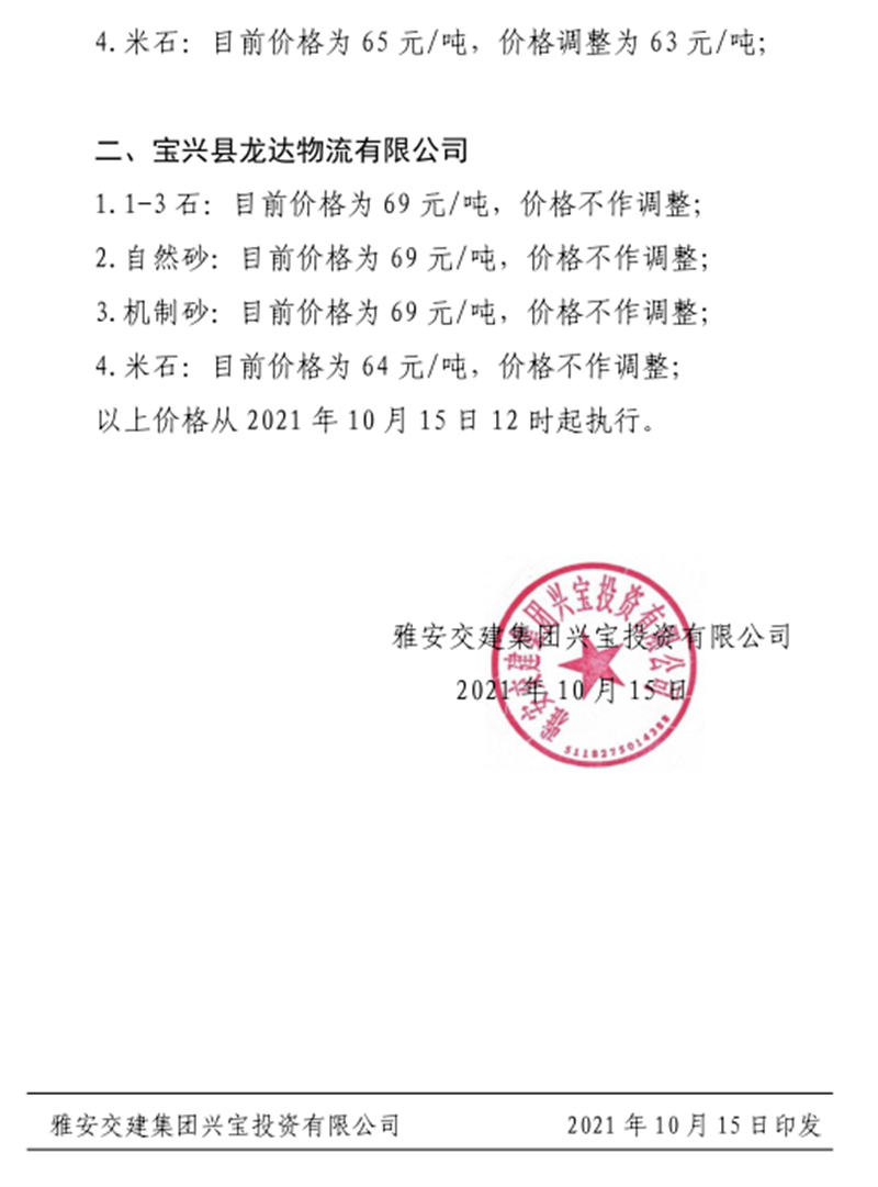 雅安交建集團興寶公司關于調(diào)整成品料銷售價格的通知(2021.10.15)
