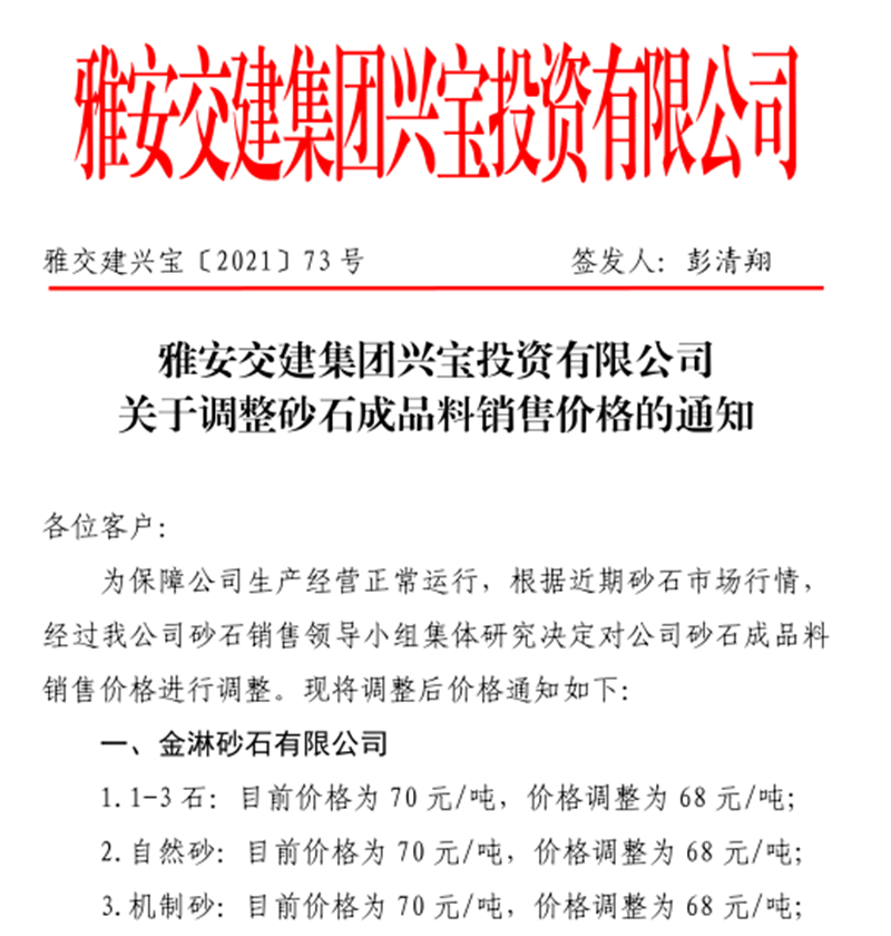 雅安交建集團云石公司關于調(diào)整成品料銷售價格的通知(2021.11.4)