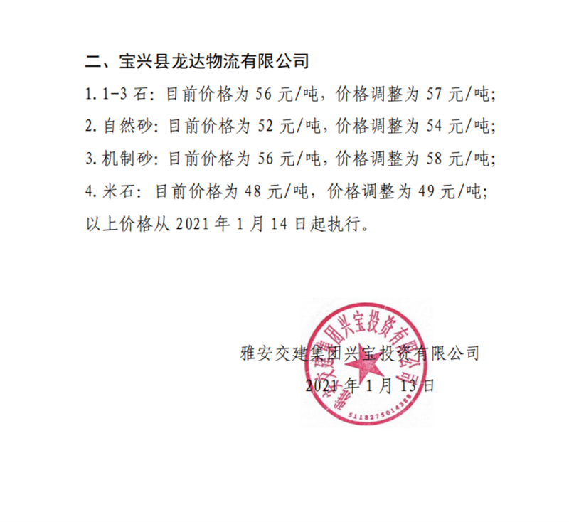 雅安交建集團興寶公司砂石骨料銷售價格情況表(2021.1.14)