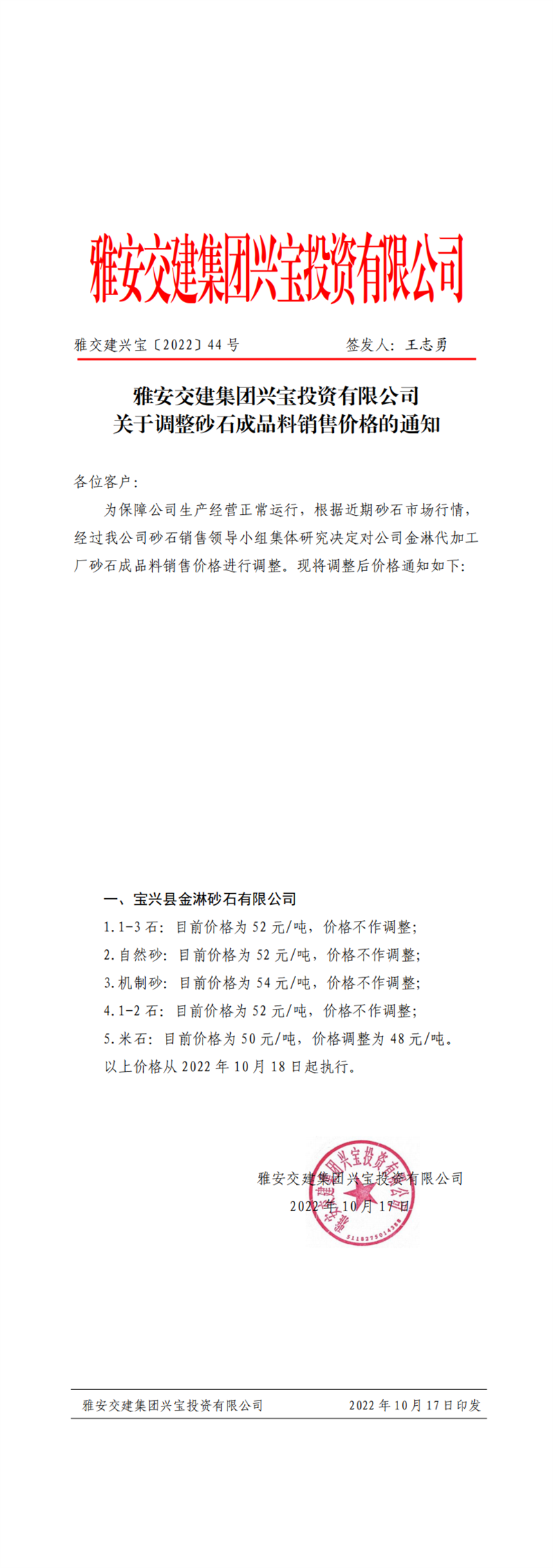 雅交建興寶〔2022〕44號 關(guān)于調(diào)整砂石成品料銷售價(jià)格的通知10.17