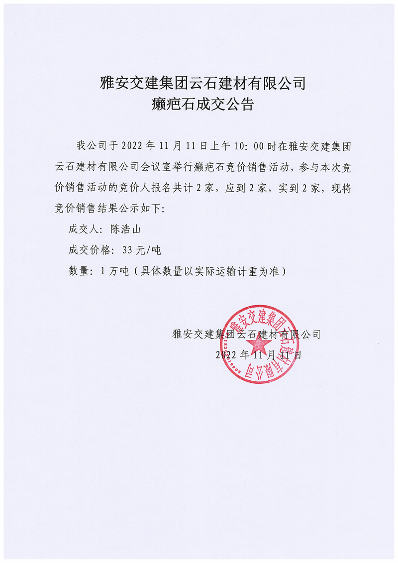 ÑŰ²½»½¨¼¯ˆF(tu¨¢n)ÔÆÊ¯½¨²ÄÓÐÏÞ¹«Ë¾°]°Ìʯ³É½»¹«¸æ11.11