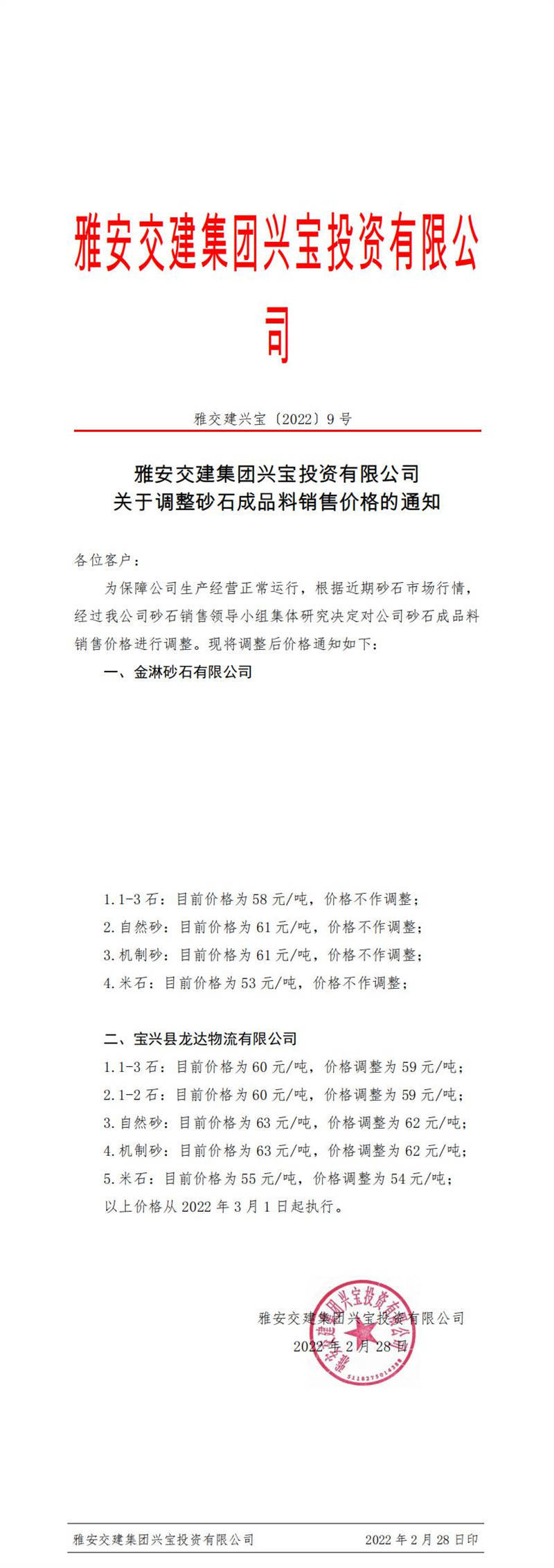 ÑŰ²½»½¨ÅdŒš¹«Ë¾êPÓÚÕ{Õûɰʯ³ÉÆ·ÁÏäNÊÛƒr¸ñµÄ֪ͨ£¨2022-3-1£©