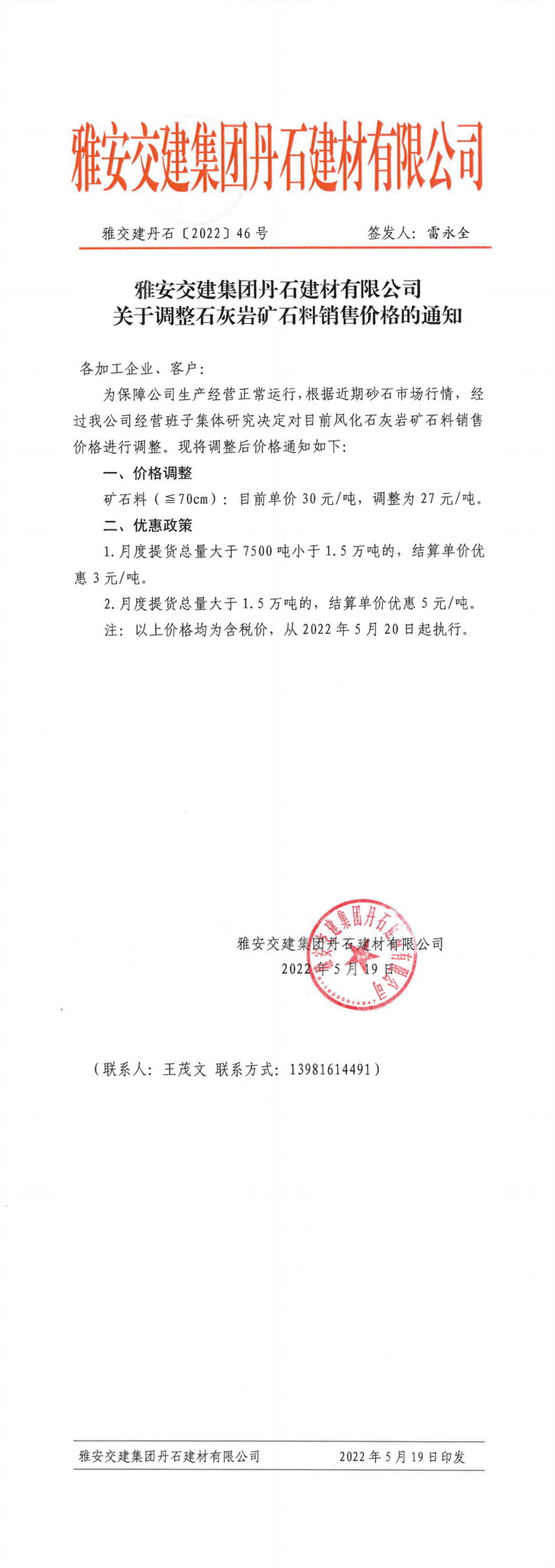 ÑŰ²½»½¨¼¯ˆF(tu¨¢n)ÅdŒš¹«Ë¾êP(gu¨¡n)ÓÚÕ{(di¨¤o)Õûɰʯ³ÉÆ·ÁÏäNÊÛƒr(ji¨¤)¸ñµÄ֪ͨ-2022-5-19