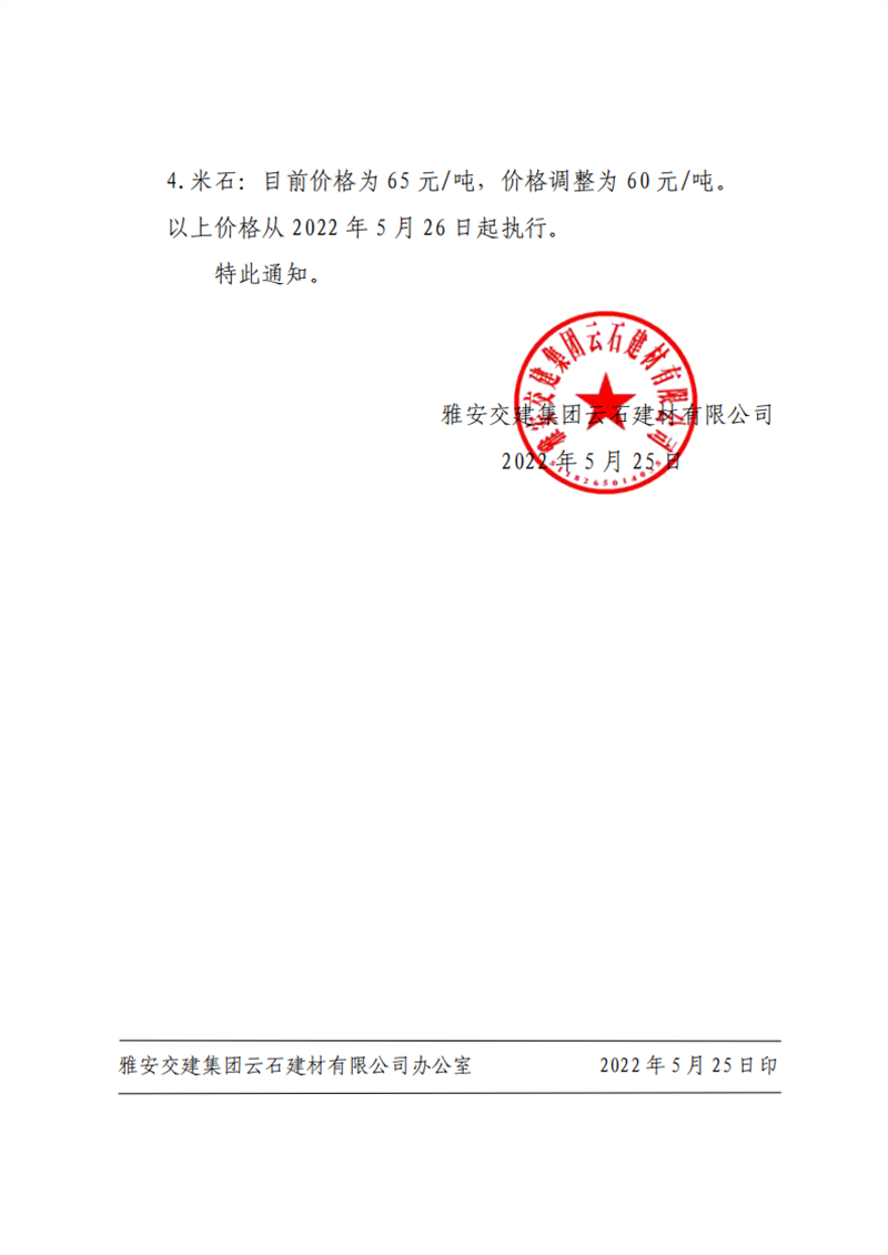 ÑŰ²½»½¨¼¯ˆFÔÆÊ¯½¨²ÄÓÐÏÞ¹«Ë¾ êP(gu¨¡n)ÓÚÕ{(di¨¤o)Õû³ÉÆ·Áσr¸ñµÄ֪ͨ--2022-5-25