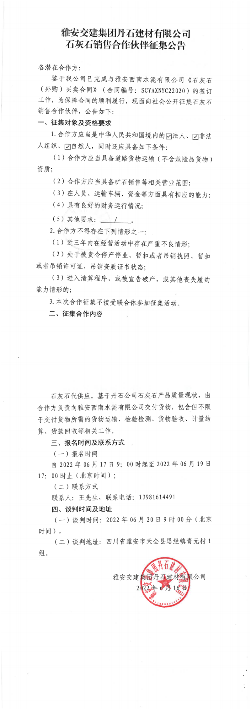 ÑŰ²½»½¨¼¯ˆF(tu¨¢n)µ¤Ê¯½¨²ÄÓÐÏÞ¹«Ë¾Ê¯»ÒʯäN(xi¨¡o)ÊÛºÏ×÷»ï°éÕ÷¼¯¹«¸æ6-16