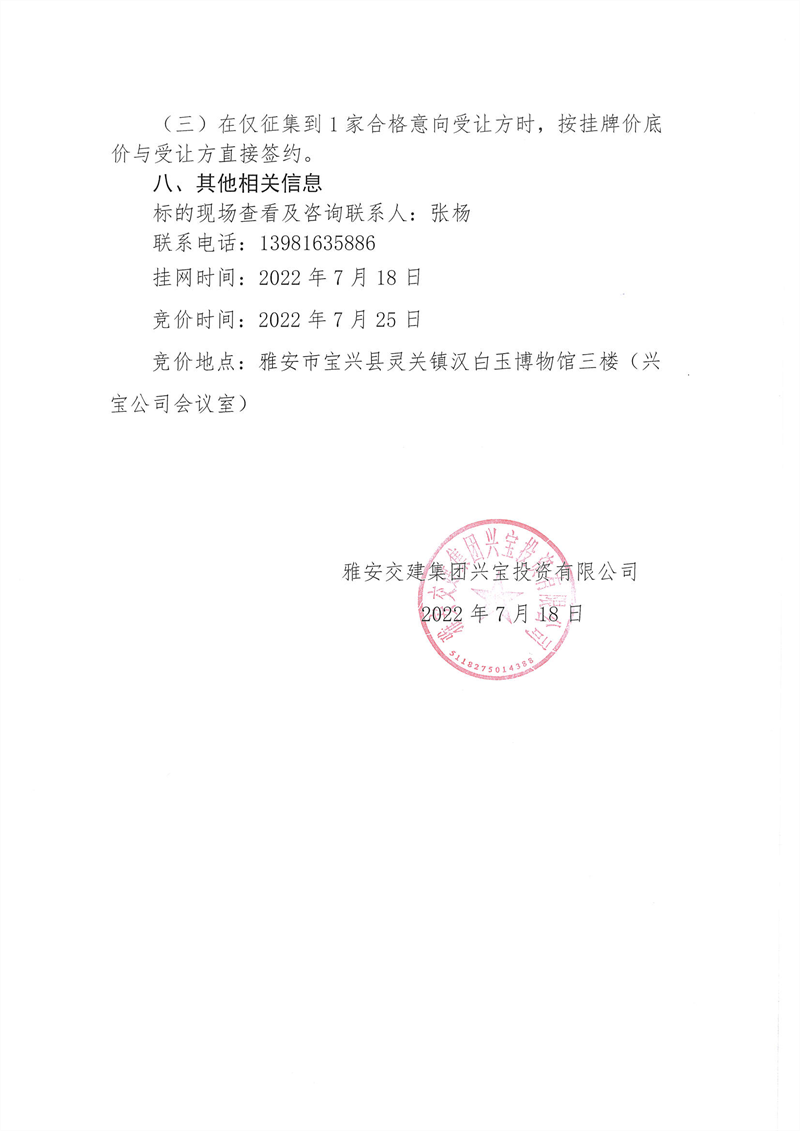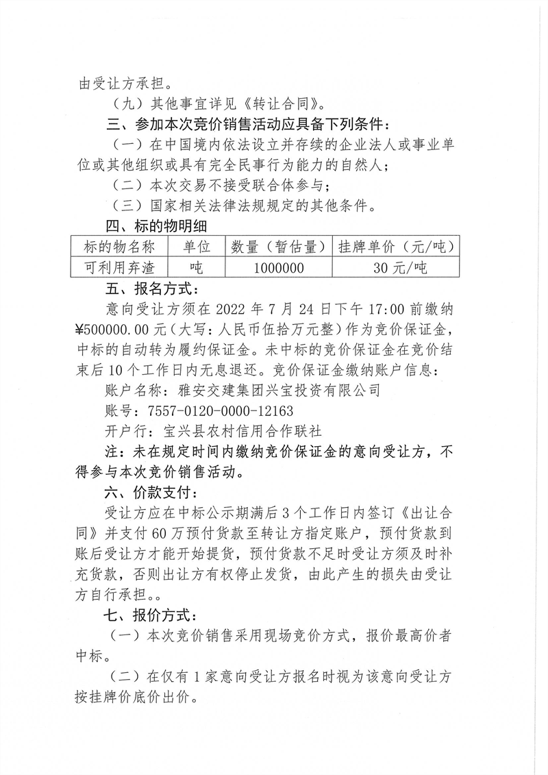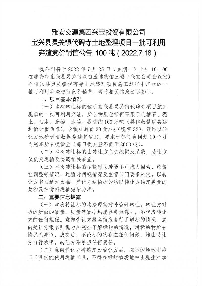興寶公司寶興縣靈關(guān)鎮(zhèn)代碑寺土地整理項(xiàng)目10萬噸可利用棄渣競價(jià)銷售掛網(wǎng)公告掛網(wǎng)公告7.22(5萬噸)