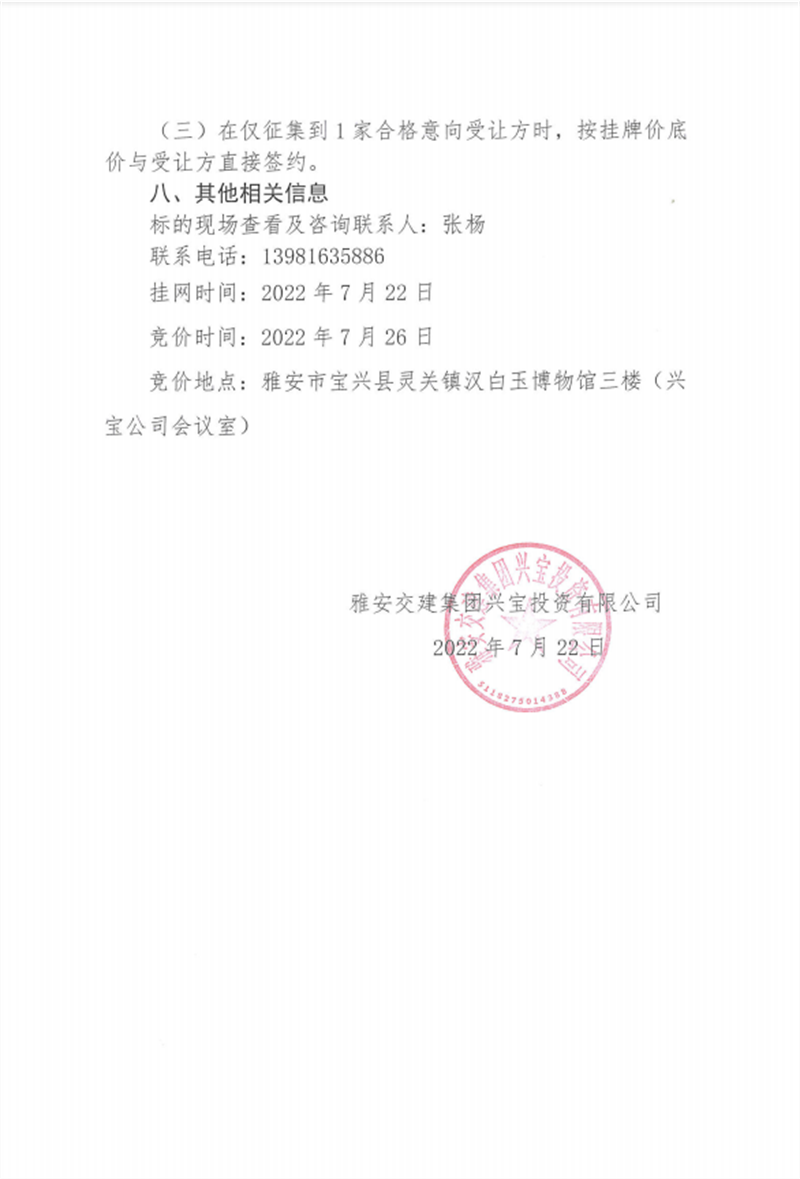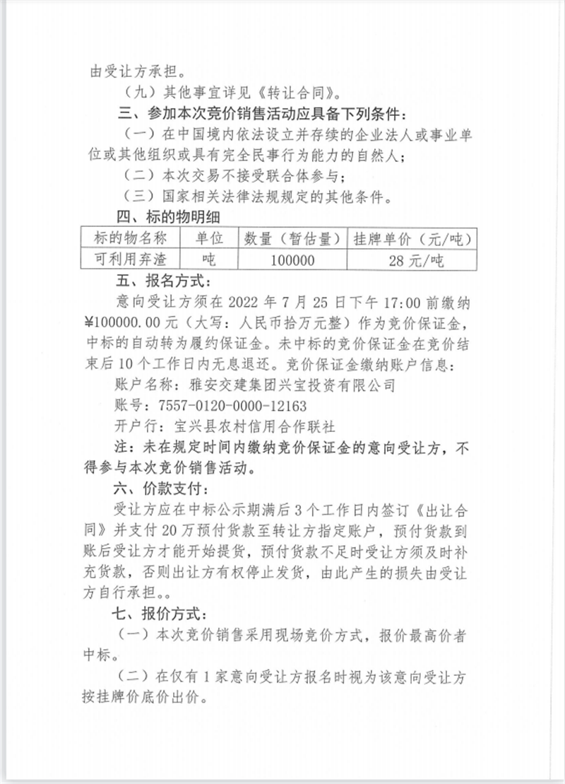 興寶公司寶興縣靈關(guān)鎮(zhèn)代碑寺土地整理項(xiàng)目10萬噸可利用棄渣競(jìng)價(jià)銷售掛網(wǎng)公告掛網(wǎng)公告7.22(5萬噸)