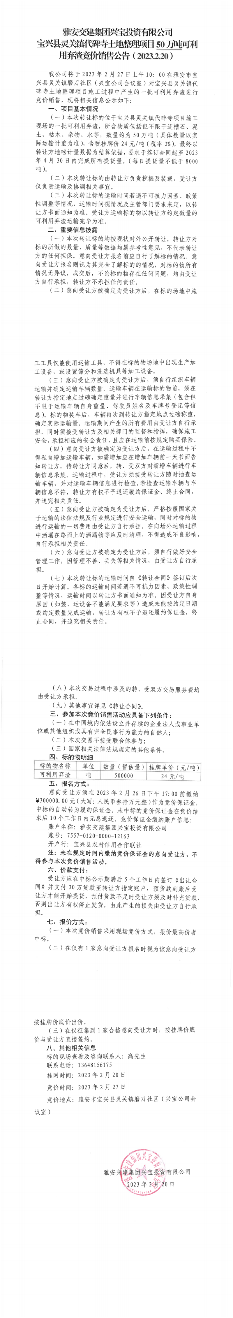 雅安交建集團興寶投資有限公司靈關鎮(zhèn)代碑寺土地整理項目50萬噸可利用棄渣競價銷售公告(2023.2.20)、