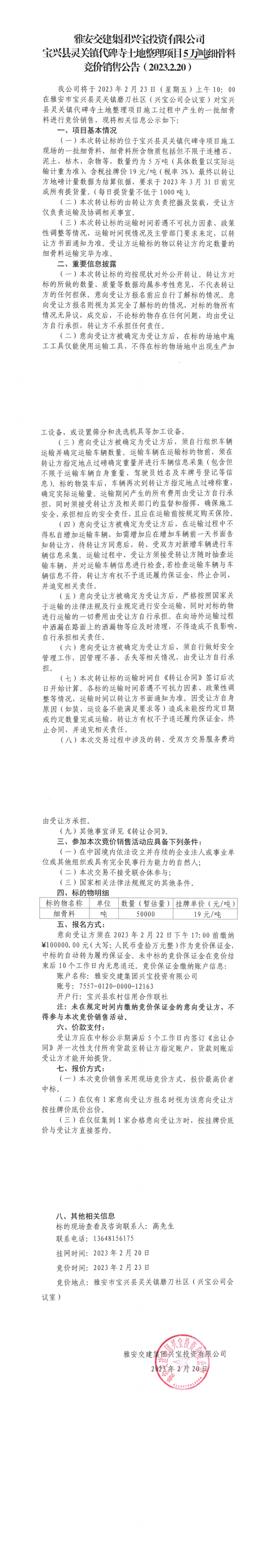 雅安交建集團興寶投資有限公司寶興縣靈關(guān)鎮(zhèn)代碑寺土地整理項目5萬噸細骨料競價銷售公告(2023.2.20)