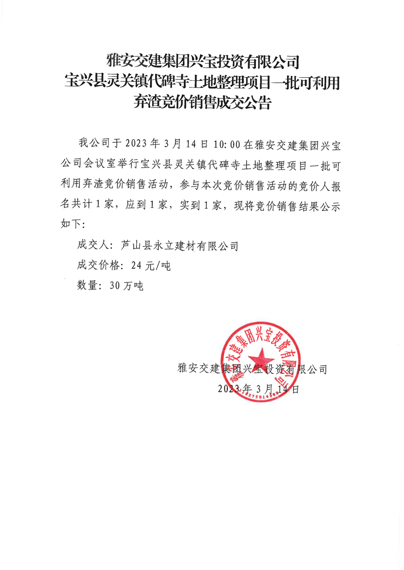 雅安交建集團興寶投資有限公司靈關(guān)鎮(zhèn)代碑寺土地整理項目30萬噸可利用棄渣競價銷售成交公告(2023.3.20)