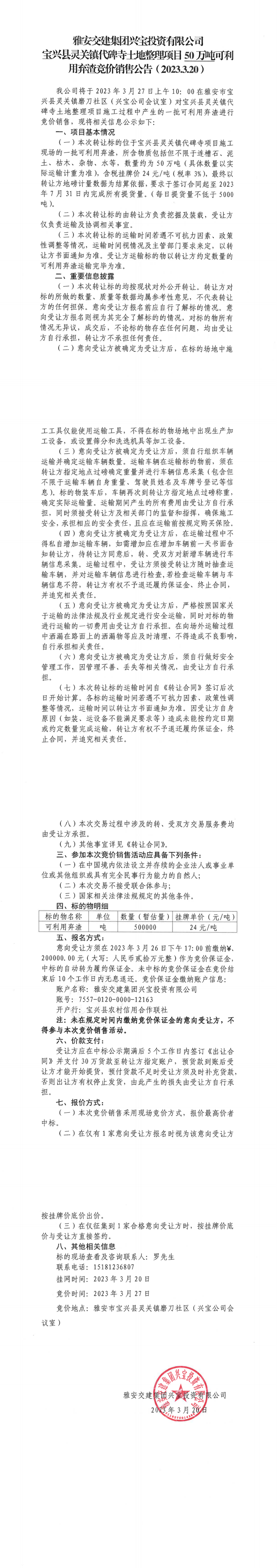 雅安交建集團(tuán)興寶投資有限公司代碑寺土地整理項(xiàng)目50萬(wàn)噸可利用棄渣競(jìng)價(jià)銷售公告(2023.3.20)