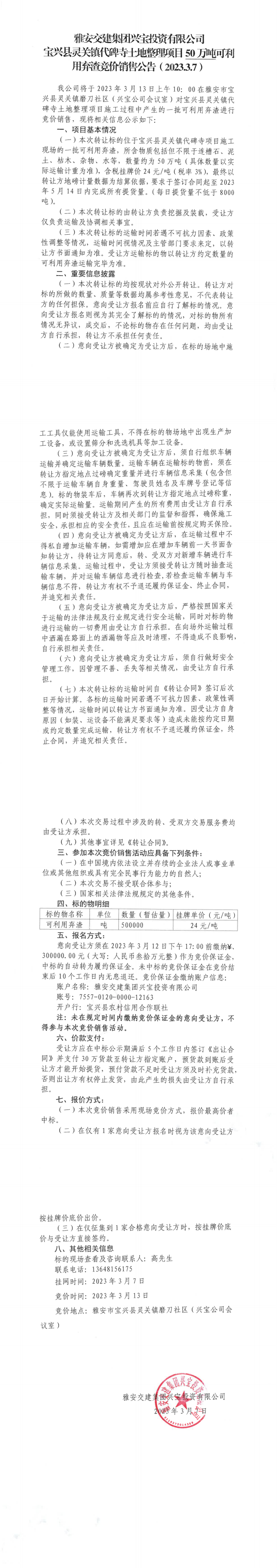 雅安交建集團興寶投資有限公司靈關(guān)鎮(zhèn)代碑寺土地整理項目30萬噸可利用棄渣競價銷售公告(2023.3.8)