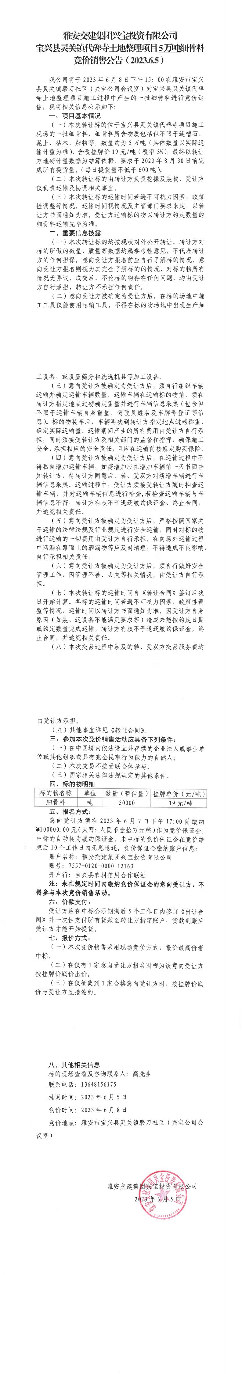 雅安交建集團興寶投資有限公司寶興縣靈關(guān)鎮(zhèn)代碑寺土地整理項目5萬噸細骨料競價銷售公告(2023.6.5)
