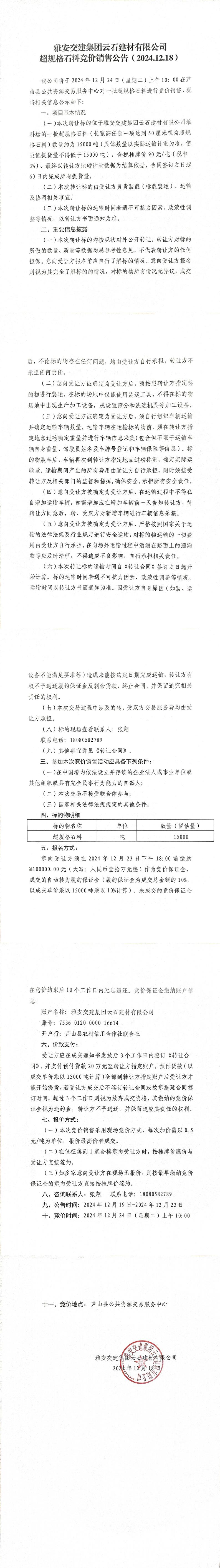雅安交建集團云石建材有限公司超規(guī)格石品料競價銷售公告(2024-12-19)