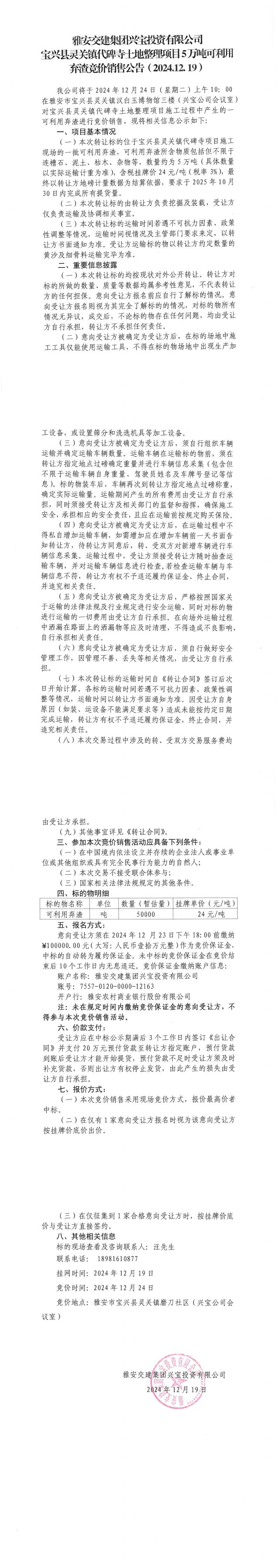 雅安交建集團(tuán)興寶投資有限公司靈關(guān)鎮(zhèn)代碑寺土地整理項(xiàng)目5萬噸可利用棄渣競(jìng)價(jià)銷售公告(2024.12.19)