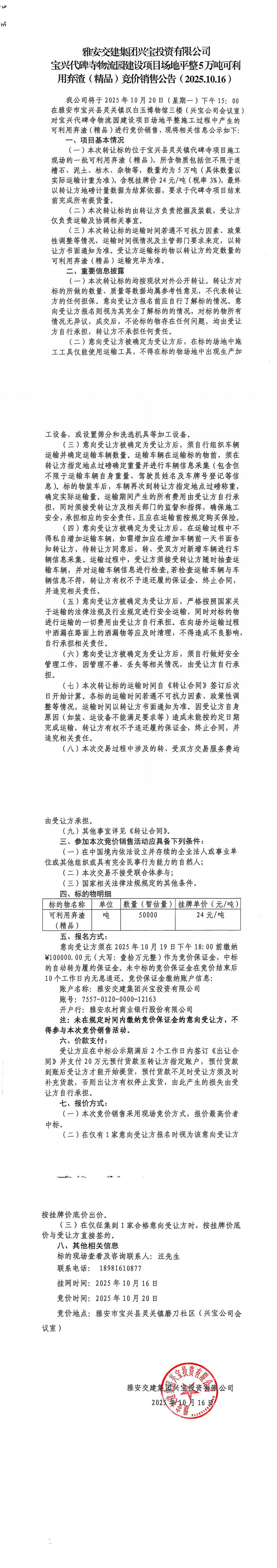 雅安交建集團(tuán)興寶投資有限公司寶興代碑寺物流園建設(shè)項(xiàng)目場(chǎng)地平整5萬(wàn)噸可利用棄渣(精品)競(jìng)價(jià)銷(xiāo)售公告(2025.10.16)