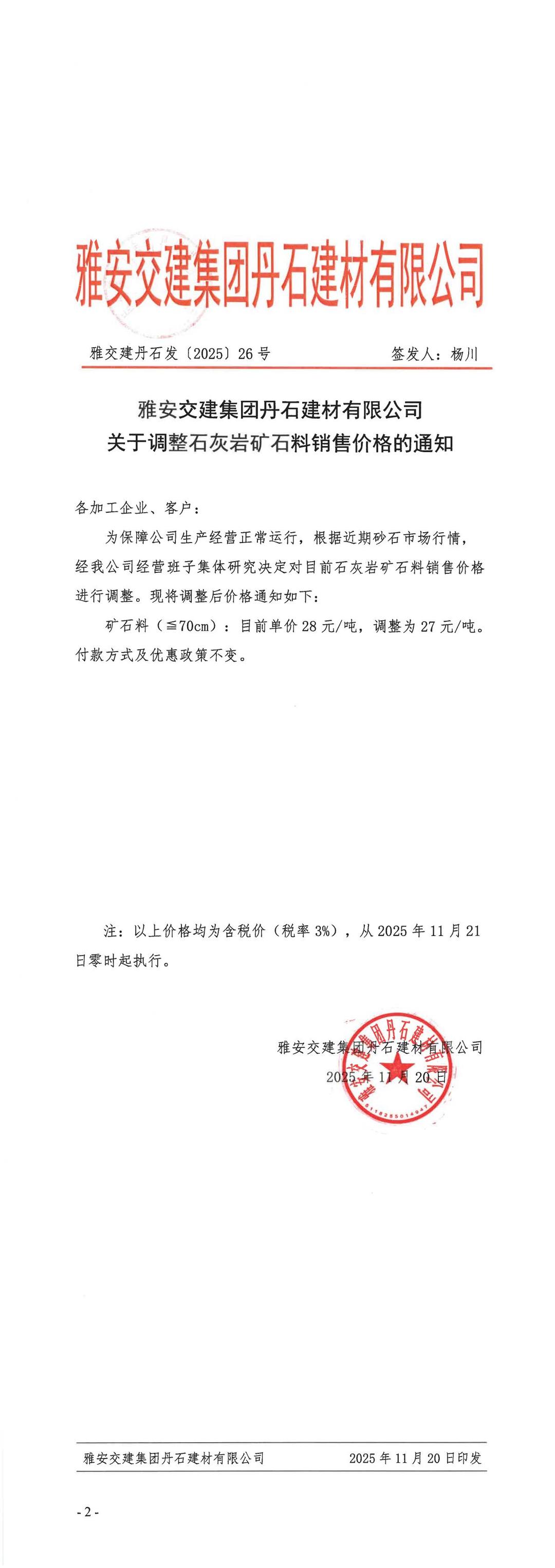 雅安交建集團(tuán)云石建材有限公司關(guān)于調(diào)整石灰?guī)r礦石料銷(xiāo)售價(jià)格的通知(2025.11.20)
